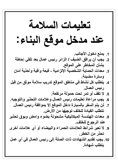 שלט - הוראות בטיחות בכניסה לאתר בניה - ערבית