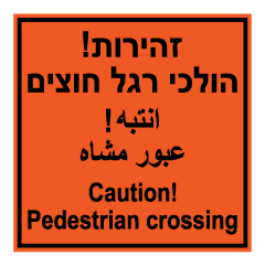 שלט - זהירות הולכי רגל חוצים - 3 שפות
