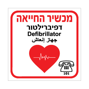 שלט - מכשיר החייאה - דפיברילטור - עברית, אנגלית וערבית
